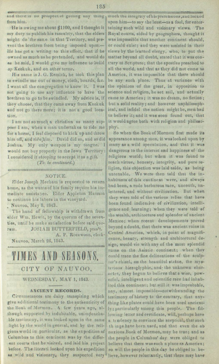 1. "Ancient Records," Times and Seasons, 1 May 1843, pp. 185-87. The Times and Seasons was published twice monthly, dated on the first and fifteenth of the month, no matter what the date of its actual release. This issue, dated Monday, May 1, picked up a story from the Quincy Whig that was published on Wednesday, May 3. Obviously it couldn't have been published before the Whig story appeared, and in fact the editorial subhead above the story on "Ancient Records" reads "CITY OF NAUVOO, WEDNESDAY, MAY 1, 1843." So the Times and Seasons issue in question was printed no earlier than Wednesday, May 3, and possibly a day or so later.