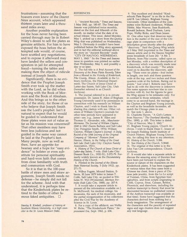 9. This excellent and detailed "Kinderhook Plate Report" is on file in the Harold B. Lee Library, Brigham Young University. Other members of the committee were Richard Amderson, William Dibble, Max Weaver, Sam Rushforth, Ronald Jackson, Reed Durham, Larry Pope, Welby Ricks, and Dean Jessee.
