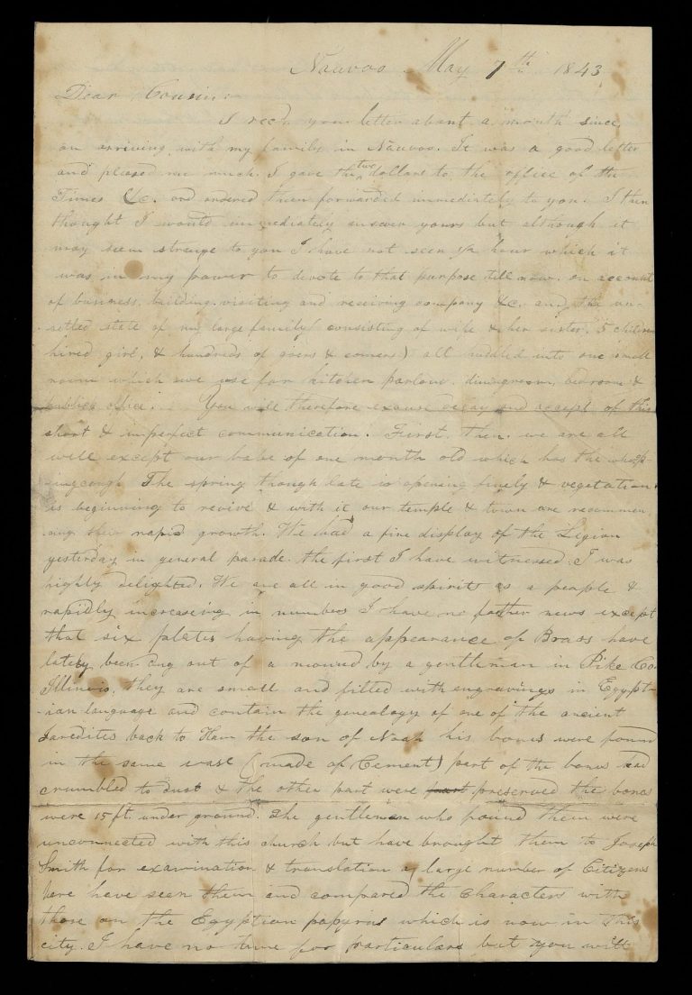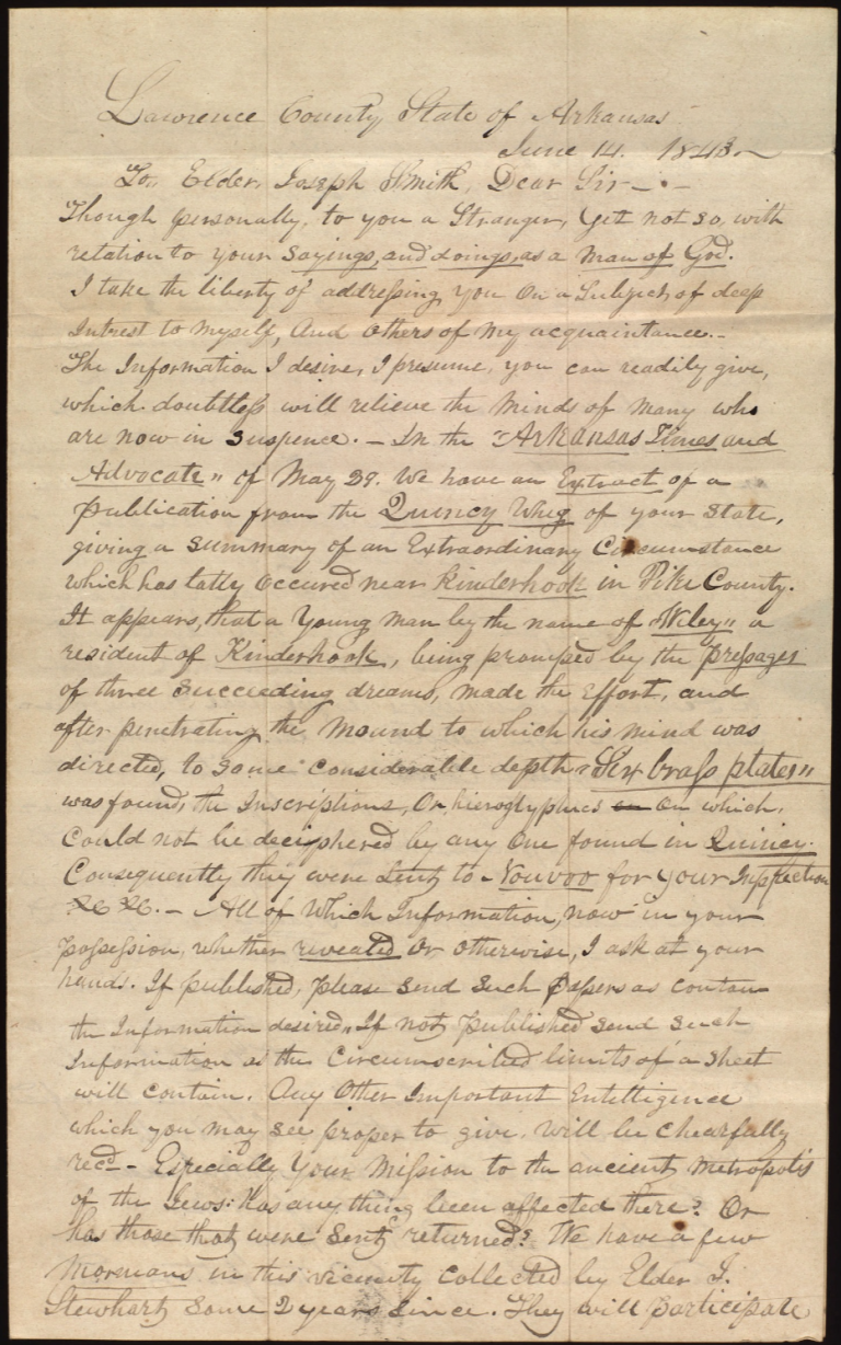 Though personally to you a Stranger, yet not so, with relation to your sayings, and doings, as Man of God. I take the liberty of addressing you On a Subject of deep Intrest to myself, And others of my acquaintance.— The Information I desire, I presume, you can readily give, which doubtless will relieve the minds of many who are now in suspence.—In the “Arkansas Times and Advocate” of May 29. we have an Extract of a publication from the Quincy Whig of your State, giving a Summary of an Extraordinary Circumstance which has latly occured near kinderhook in Pike County. It appears, that a Young man by the name of [Robert] “Wiley” a resident of Kinderhook, being promp[t]ed by the pressages of three Succeeding dreams, made the effort, and after penetrating the Mound to which his mind was directed, to some considerable depth “Six brass plates” was found, the Inscriptions, Or hieroglyphics on on which, Could not be deciphered by any one found in Quincy. Consequently they were Sent to— Nauvoo for your Inppection &c &c.— All of which Information, now in your possession, whether rivealed Or, otherwise, I ask at your hands. If published, please send such Papers as contain the Information desired, If not published send such Information as the Circumscribed limits of a Sheet will contain. Any Other Important Entelligence which you may see proper to give, will be Chearfully recd...