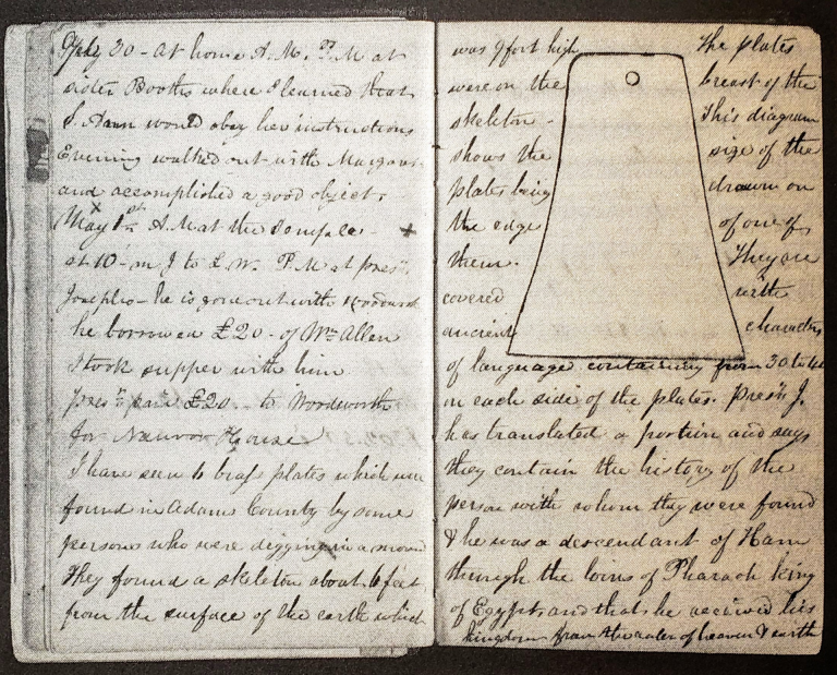 [May 1, 1843. Monday.] . . . P.m. at President Josephs…I have seen 6 brass plates which were found in Adams County…Prest. J[oseph] has translated a portion and says they contain the history of the person with whom they were found & he was a descendant of Ham through the loins of Pharaoh king of Egypt, and that he received his kingdom from the ruler of heaven & earth.