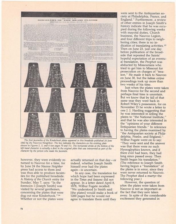 The editorial further reported: "Mr. Smith has had those plates, what his opinion concerning them is, we have not yet ascertained. The gentleman that owns them has taken them away, or we should have given a fac simile of the plates and characters in this number. We are informed however, that he purposes returning with them for translation; if so, we may be able yet to furnish our readers with it."