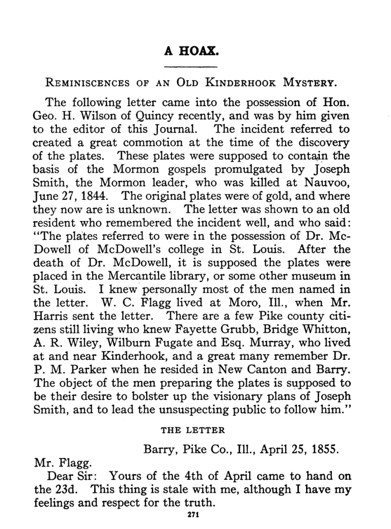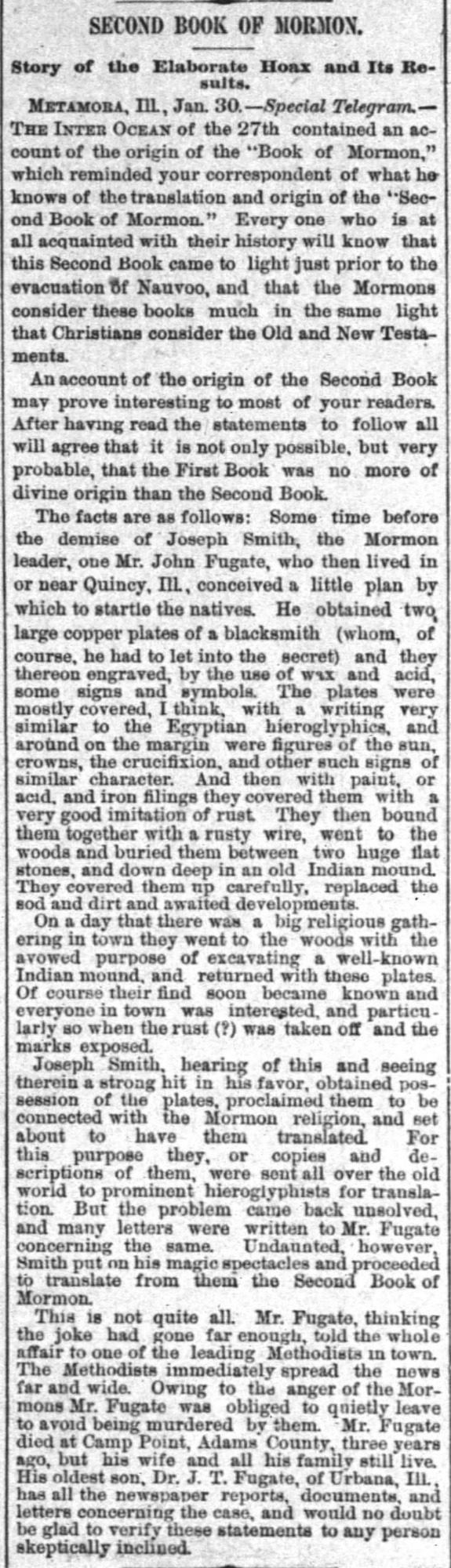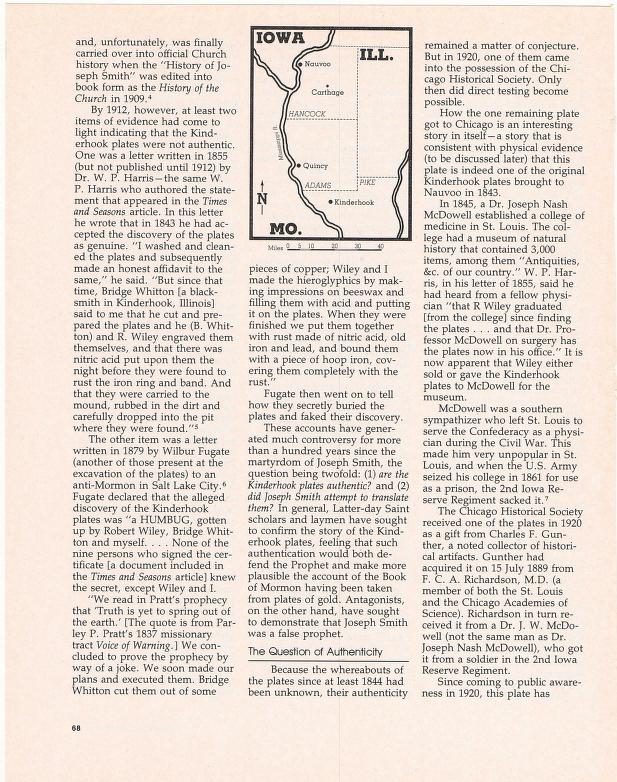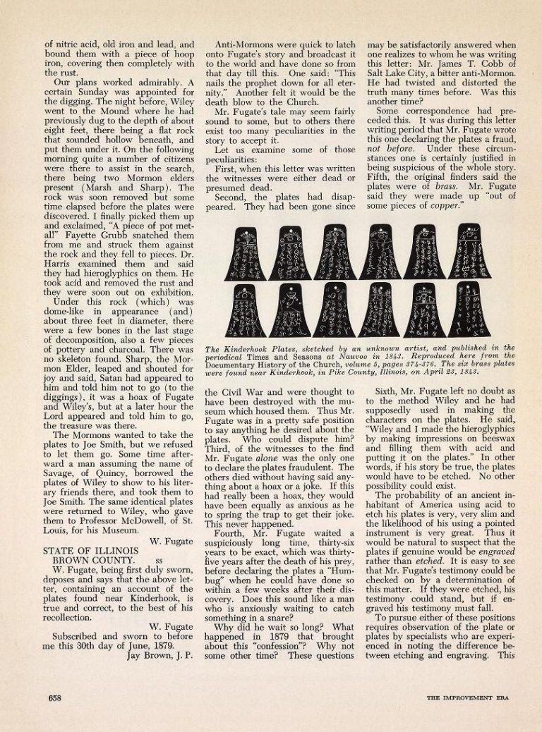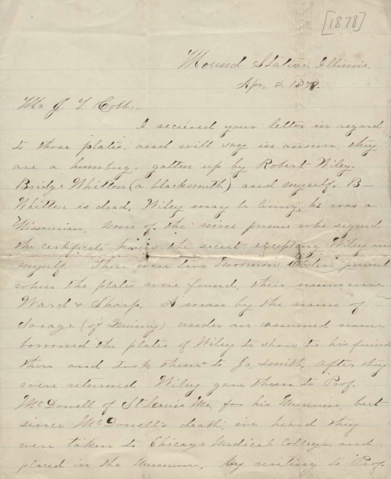The other item was a letter written in 1879 by Wilbur Fugate (another of those present at the excavation of the plates) to an anti-Mormon in Salt Lake City. Fugate declared that the alleged discovery of the Kinderhook plates was "a HUMBUG, gotten up by Robert Wiley, Bridge Whitton and myself. . . . None of the nine persons who signed the certificate [a document included in the Times and Seasons article] knew the secret, except Wiley and I.