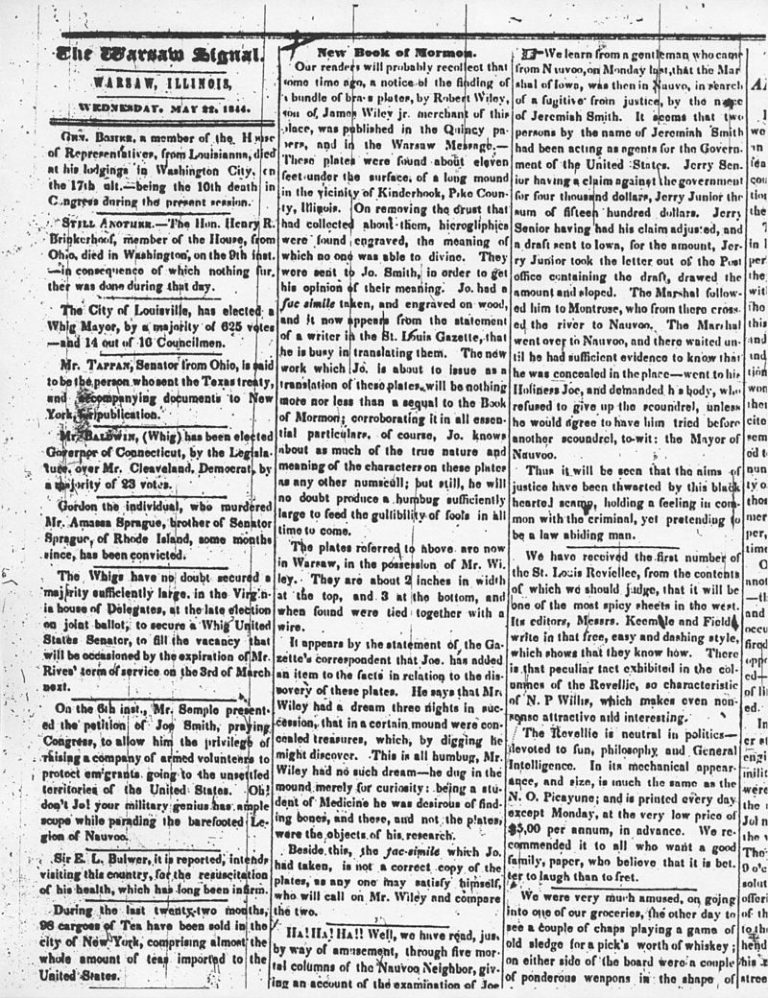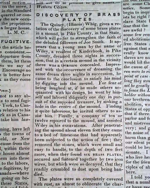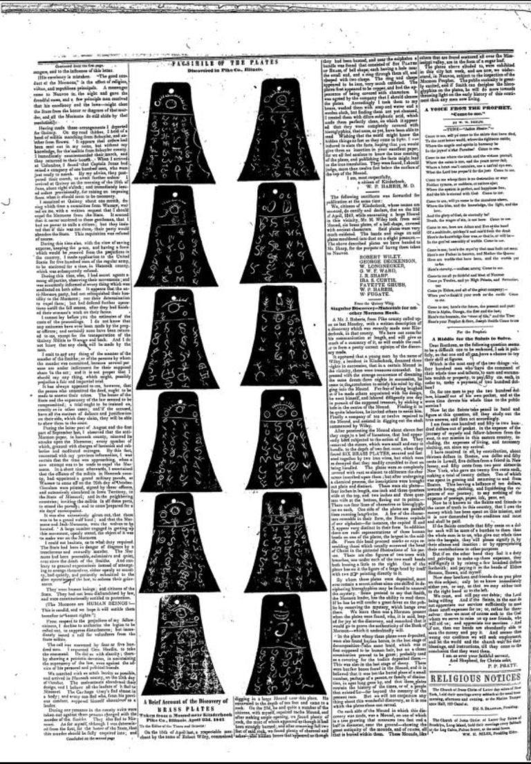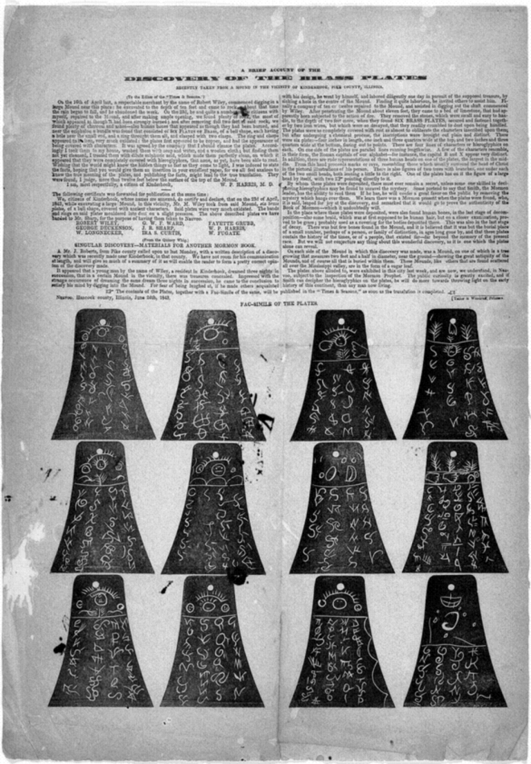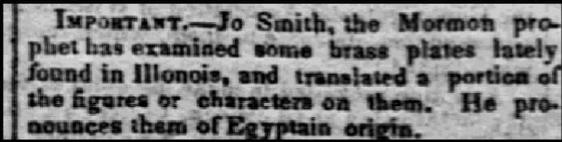Jo Smith, the Mormon prophet has examined some brass plates lately found in Illonois [sic], and translated a portion of the figures or characters on them. He pronounces them of Egyptian origin.