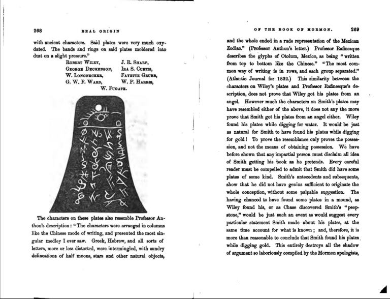 We the citizens of Kinderhook, whose names are annexed do certify and declare that on the 23d April, 1843, while excavating a large mound, in this vicinity, Mr. R. Wiley took from said mound, six brass plates of a bell shape, covered with ancient characters. Said plates were very much oxidated-the bands and rings on said plates mouldered into dust on a slight pressure. The above described plates we have handed to Mr. Sharp for the purpose of taking them to Nauvoo. ROB'T WILEY, W. P. HARRIS, G. W. F. WARD, W. LONGNECKER, FAYETTE GRUBB, IRA S. CURTIS, GEO. DECKENSON, W. FUGATE, J. R. SHARP.