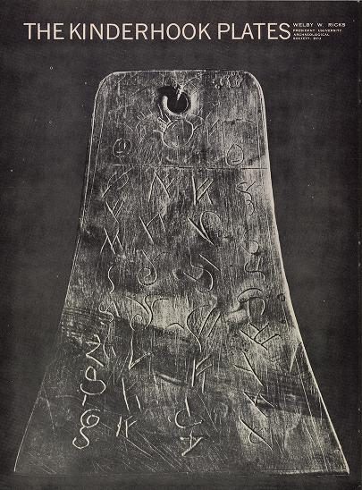 It appears that a young man by the name of Wiley, a resident in Kinderhook, dreamed three nights in succession, that in a certain mound in the vicinity, there was treasures concealed. Impressed with the strange occurrence of dreaming the same dream three nights in succession, he came to the conclusion, to satisfy his mind by digging into the mound. For fear of being laughed at, if he made others acquainted with his design, he went by himself, and labored diligently one day in pursuit of the supposed treasure, by sinking a hole in the centre of the mound. Finding it quite laborous, he invited others to assist him. Finally, a company of ten or twelve repaired to the mound, and assisted in digging out the shaft commenced by Wiley. After penetrating the mound about 11 feet, they came to a bed of limestone, that had apparently been subjected to the action of fire, they removed the stone, which were small and easy to handle, to the depth of two feet more, when they found SIX BRASS PLATES, secured and fastened together by two iron wires, but which were so decayed, that they readily crumbled to dust upon being handled. The plates were so completely covered with rust as almost to obliterate the characters inscribed upon them; but after undergoing a chemical process, the inscriptions were brought out plain and distinct. -- There were six plates -- four inches in length, one inch and three quarters wide at the top, and two inches and three quarters wide at the bottom, flaring out to points. There are four lines of characters or hieroglyphics on each; on one side of the plates are parallel lines running lengthwise. A few of the characters resemble, in their form, the Roman capitals of our alphabet -- for instance, the capital B and X appear very distinct. In addition, there are rude representations of three human heads on one of the plates, the largest in the middle; from this head proceeds marks or rays, resembling those which usually surround the head of Christ, in the pictorial representations of his person. There is also figures of two trees with branches, one under each of the two small heads, both leaning a little to the right. One of the plates, has on it the figure of a large head by itself, with two ==> pointing directly to it.