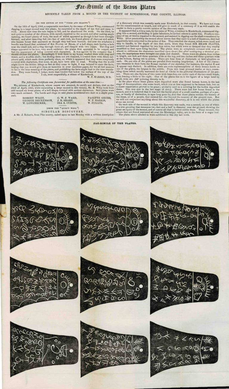 On the 16th of April last a respectable merchant by the name of Robert Wiley, commenced digging a large mound near this place: he excavated to the depth of 10 feet and came to rock; about that time the rain began to fall, and he abandoned the work. On the 23d he and quite a number of the citizens with myself, repaired to the mound, and after making ample opening, we found plenty of rock, the most of which appeared as though it had been strongly burned; and after removing full two feet of said rock, we found plenty of charcoal and ashes; also human bones that appeared as though they had been burned; and near the encephalon a bundle was found that consisted of six plates of brass, of a bell shape, each having a hole near the small end, and a ring through them all, and clasped with two clasps, the ring and clasps appeared to be of iron very much oxidated, the plates appeared first to be copper, and had the appearance of being covered with characters. It was agreed by the company that I should cleanse the plates: accordingly I took them to my house, washed them with soap and water, and a woolen cloth; but finding them not yet cleansed I treated them with dilute sulphuric acid which made them perfectly clean, on which it appeared that they were complete covered with hieroglyphics that none as yet have been able to read. Wishing that the world might know the hidden things as fast as they come to light, I was induced to state the facts, hoping that you would give it an insertion in your excellent, paper for we all feel anxious to know the true meaning of the plates, and publishing, the facts might lead to the true translation. They were found, I judged, more than twelve feet below the surface of the top of the mound.
