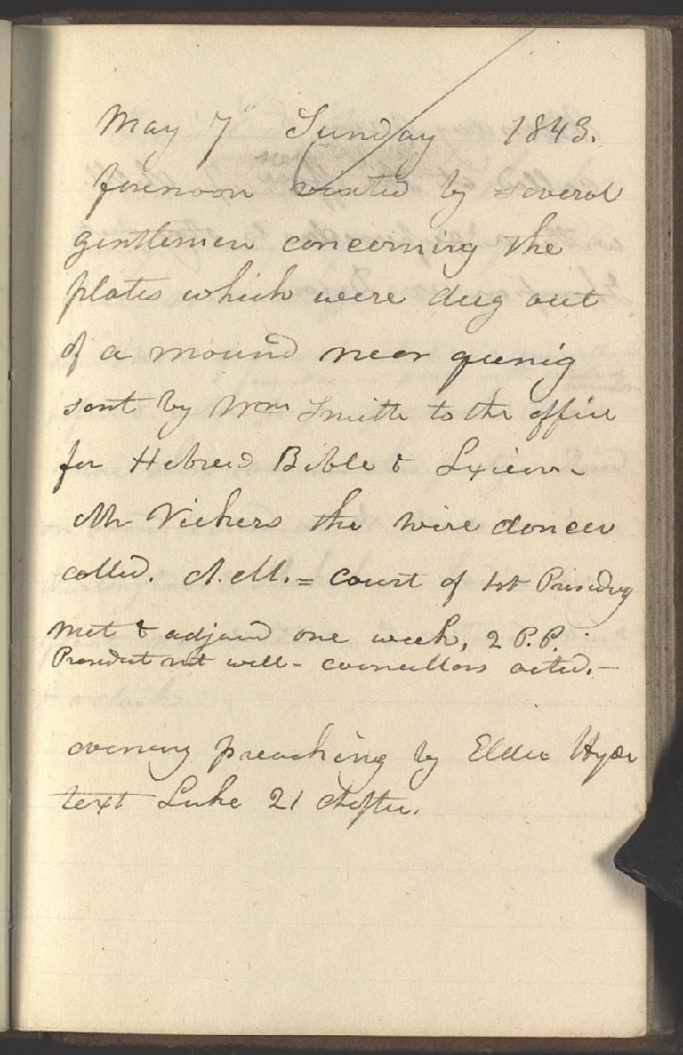 May 7[th] Sunday 1843. forenoon visited by several gentlemen concerning the plates which were dug out of a mound near quncy [Quincy] sent by Wm Smith to the office for Hebrew Bible & Lexicon