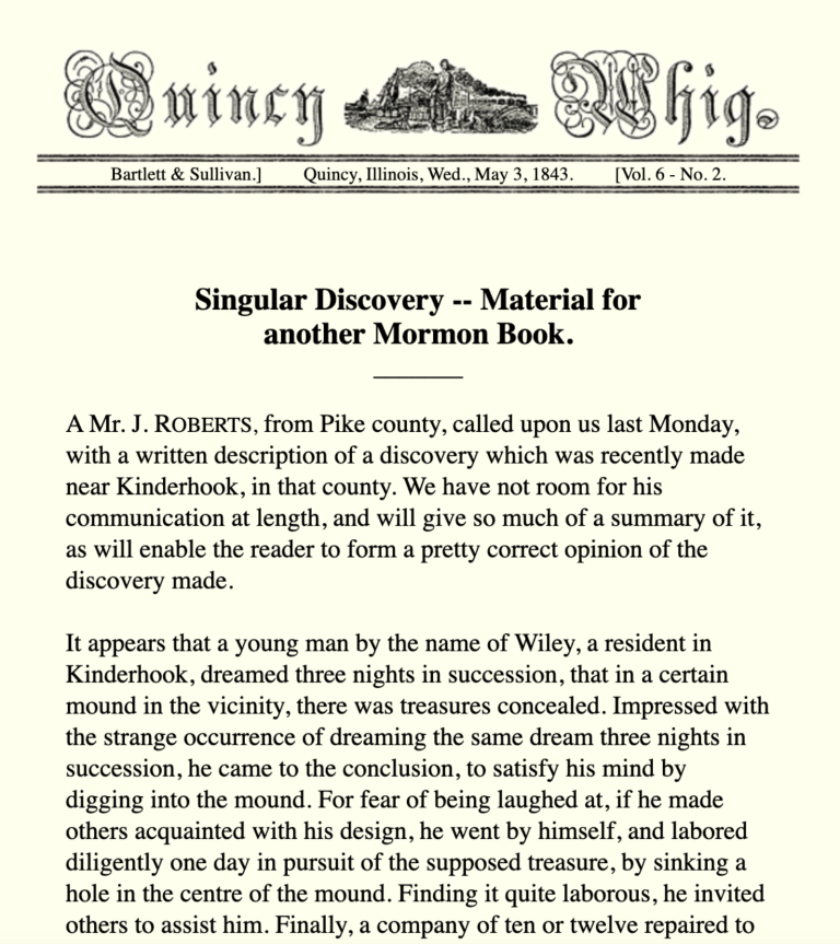 ["Singular Discovery—Material for another Mormon Book," Quincy Whig 6, no. 2 (May 3, 1843).]