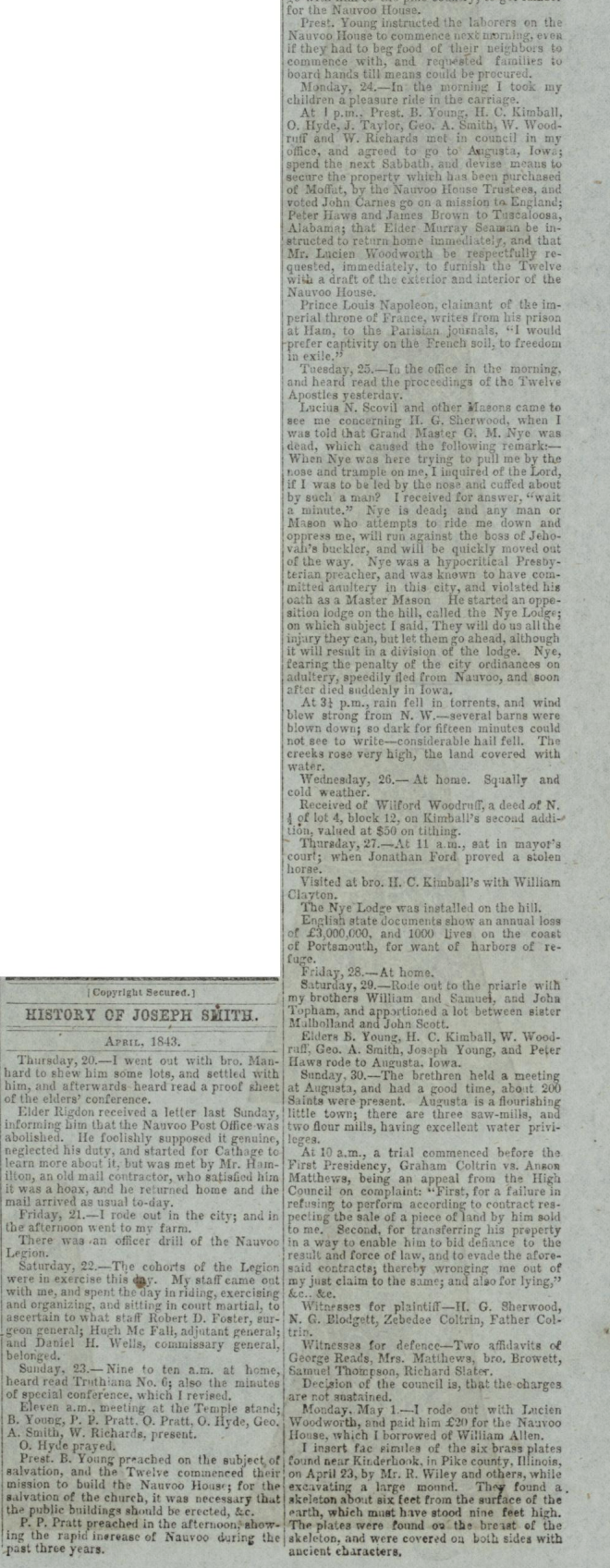 Although this account appears to be the writing of Joseph Smith, it is actually an excerpt from a journal of William Clayton. It has been well known that the serialized "History of Joseph Smith" consists largely of items from other persons' personal journals and other sources, collected during Joseph Smith's lifetime and continued after the Saints were in Utah, then edited and pieced together to form a history of the Prophet's life "in his own words." It was not uncommon in the nineteenth century for biographers to put the narrative in the first person when compiling a biographical work, even though the subject of the biography did not actually say or write all the words attributed to him; thus the narrative would represent a faithful report of what others felt would be helpful to print. The Clayton journal excerpt was one item used in this way. For example, the words "I have translated a portion" originally read "President J. has translated a portion. . . ."
